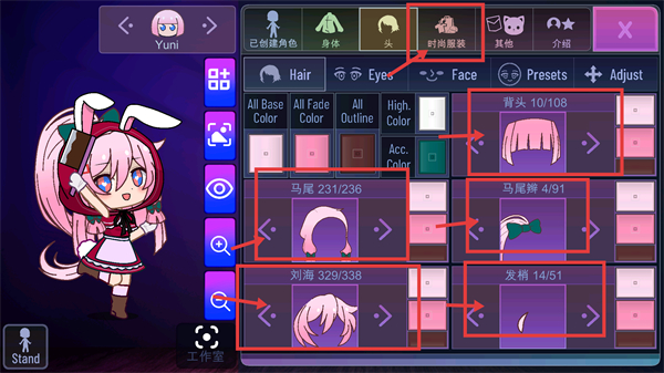 3、在头部装扮界面,选择被框选的发型(如马尾-231/236),调整角色头部外观,完成个性化装扮的设置。