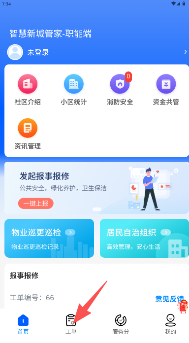 1、在首页点击底部导航栏“工单”管理模块。