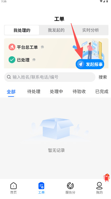 2、进入工单页面点击“发起报事”。