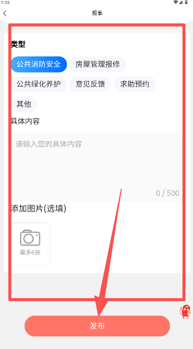 3、在报事页面选择填写完善信息点击发布提交。