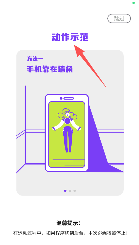 2、训练前展示动作示范含手机摆放方法,助力掌握正确准备方式,保障跳绳计数的准确性。
