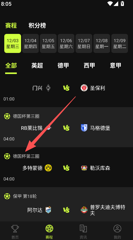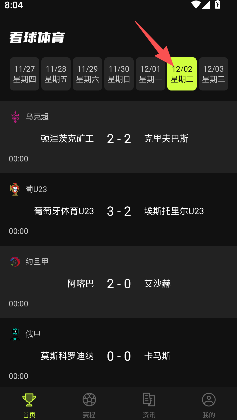 1、打开软件后、进入首页选择对应日期、查看当日各类赛事信息。