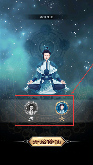 1、进入游戏后选择【男】或【女】身份,点击【开始修仙】按钮,开启你的修真生涯,这是踏入修仙世界的第一步。