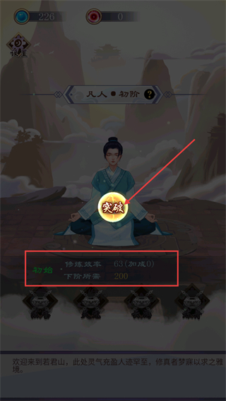 2、在若君山闭关修炼时,关注【修炼效率】数值,当灵气达到【下阶所需】要求,点击【突破】按钮进阶。