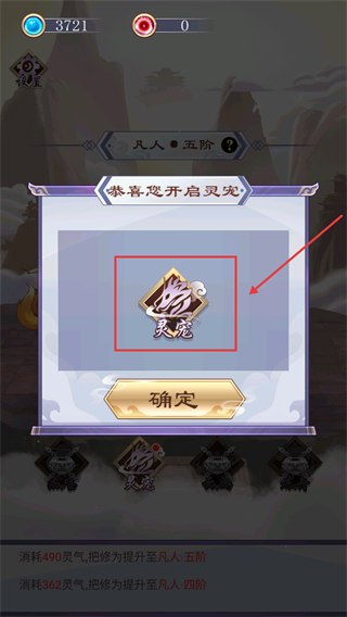 3、修炼到一定阶段会开启【灵宠】玩法,点击【确定】按钮确认开启,灵宠将助力你的修仙之旅。