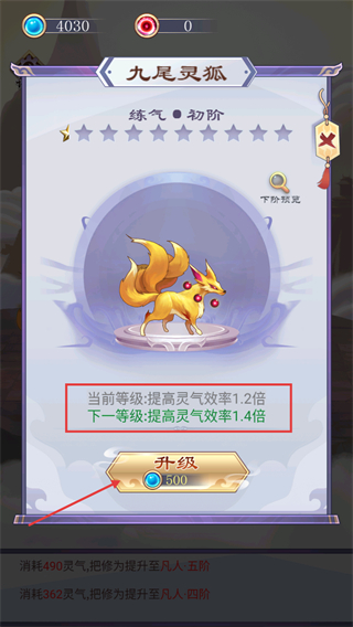 4、获得【九尾灵狐】后,可消耗灵气升级,提升【灵气效率】倍数,加速修炼进度,助力突破更高阶。