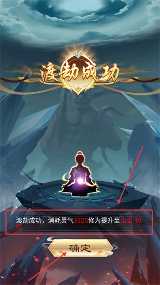 2、渡劫成功后修为提升至【出世·初阶】,消耗【灵气】3325,点击确定按钮解锁新玩法推进修仙进程。