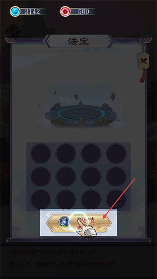 2、法宝升级需消耗寿元购买并两两合成同品阶法宝,提升后的法宝能有效加快修炼时的灵气聚集效率。