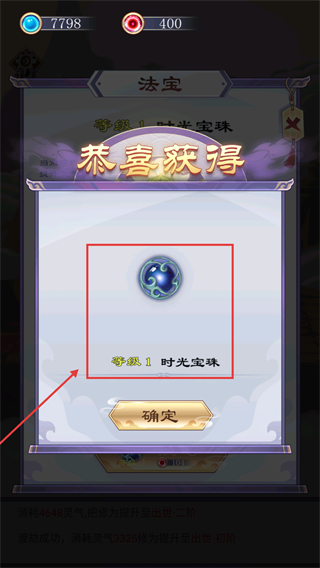 4、锻造后获得【等级1时光宝珠】,点击确定领取,该法宝可提升修炼效率助力更快突破境界。