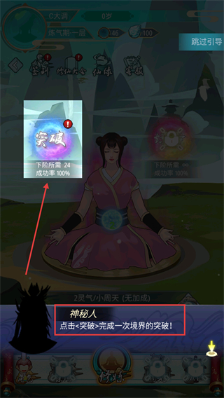 3、当界面显示【突破】按钮时,点击可进行境界突破,达成条件后成功率【100%】,助力快速提升修仙等级。