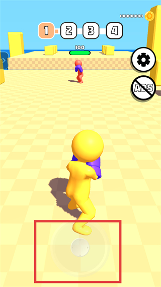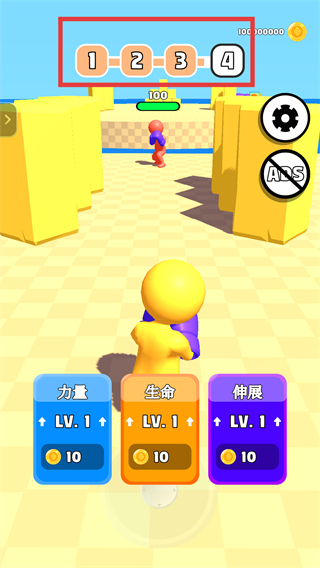 1、进入关卡界面,留意上方【1-2-3-4】的关卡标识,通过底部操作区域控制角色,同时可借助【ADS】功能辅助推进关卡。