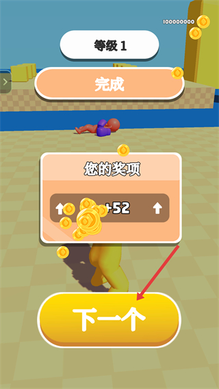 3、完成关卡后,可领取【您的奖项-+52】的奖励,当前处于【等级1】,点击【下一个】按钮进入后续关卡流程。