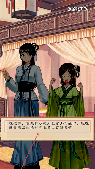 1、作为金家少爷,先去书房收拾行李,为上京赶考做准备,开启科举修仙的第一步,选择人生走向。