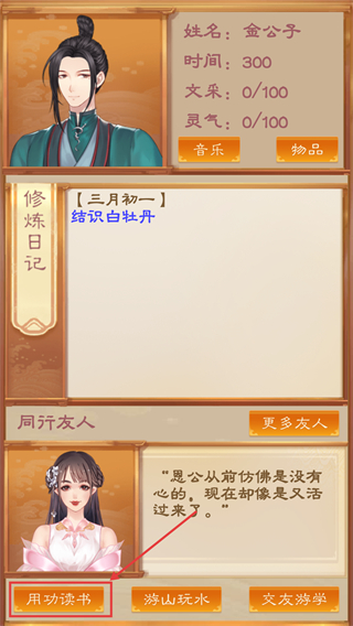 3、日常可选择用功读书提升文采,或交友游学结识如白牡丹的角色,积累灵气,推进修炼日记进度。