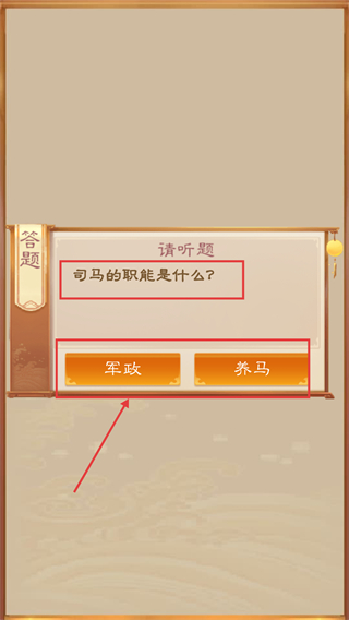 4、科举答题时,遇到司马职能类问题,选择正确答案军政,提升正确率,更快通过考试晋升。