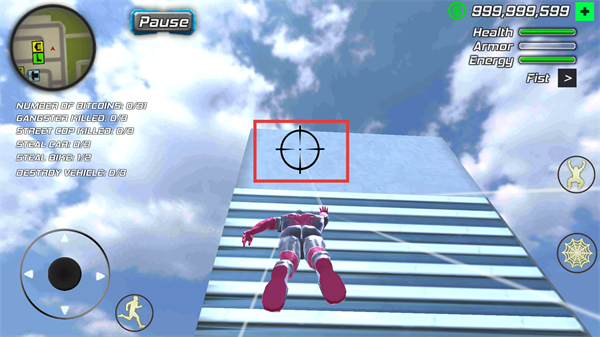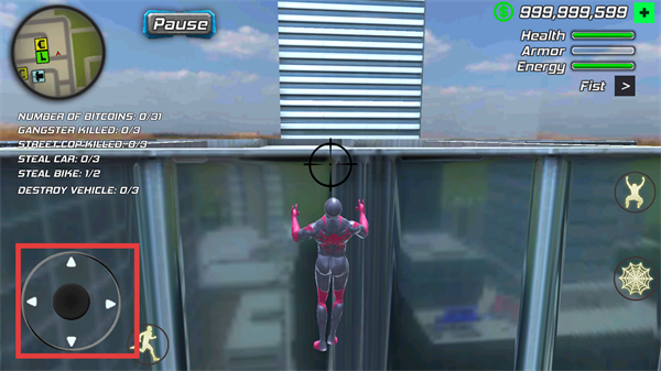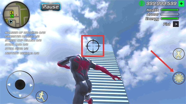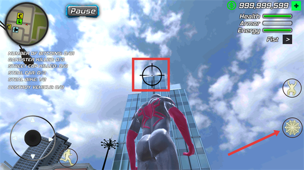 1、点击【红框内瞄准标识】对应的建筑区域,再使用【蜘蛛技能按钮】,触发攀爬建筑的操作。
