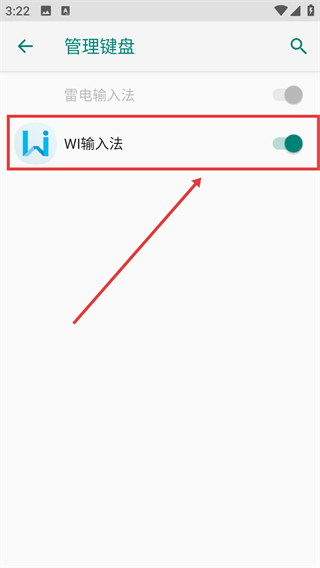 2、进入管理键盘页面,找到【WI输入法】对应的开关并打开,完成该输入法的启用设置。