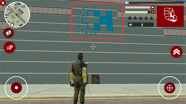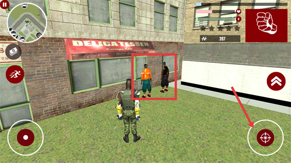 3、操控角色靠近【红框内目标角色】,点击【右侧瞄准按钮】,触发战斗交互完成对应任务。