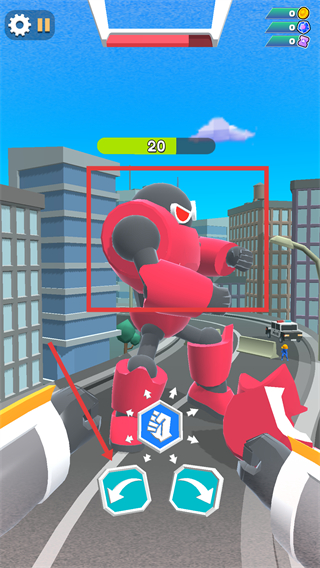 2、战斗中操控【左右箭头】调整机甲位置,点击【拳头图标】对【红色机甲】发起攻击,消耗其血量。