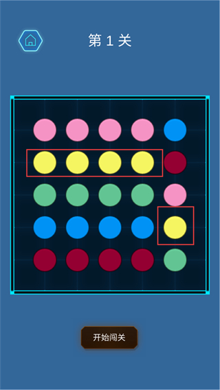 1、在【第1关】界面先记住黄色球的位置分布,然后点【开始闯关】按钮进入关卡,准备移动操作哦。