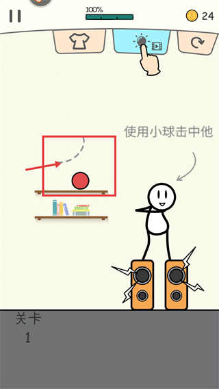 2、处于【关卡1】界面,定位红框内的红色小球,按虚线轨迹发射该小球,目标是击中对应的火柴人,推进当前关卡的进度。