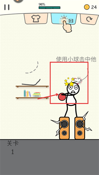3、红色小球击中红框内的火柴人后,触发其对应的反馈效果,此时关卡进度更新,完成该关卡的核心击中任务。