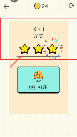 4、完成关卡后看到【关卡1】的【完美】评级与三星标识,点击带【+245】标识的【打开】按钮,可获取对应的金币奖励。