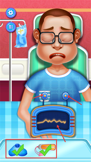 2、进入病房场景后,先确认【医疗设备】的连接状态,同时检查托盘内已准备好的【治疗物品】,确保治疗前的准备工作完成。