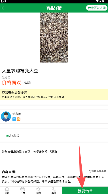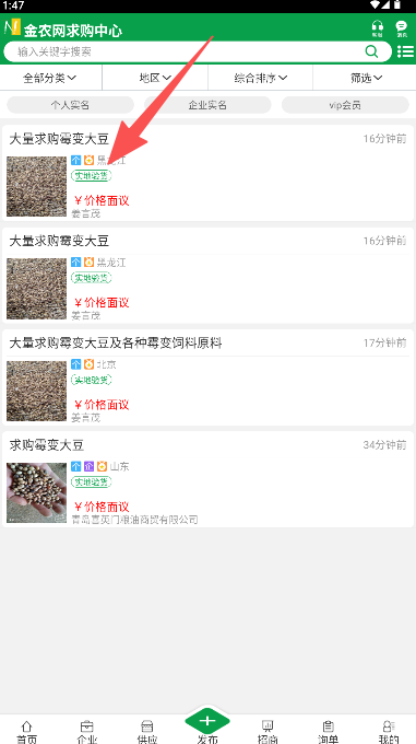 2、在列表查找并点击“大量求购霉变大豆”等目标信息。