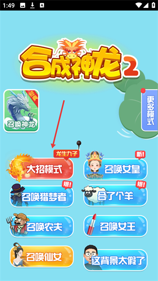1、进入合成神龙2主界面,选择【大招模式】开始游戏,通过点击对应按钮开启进化冒险之旅。