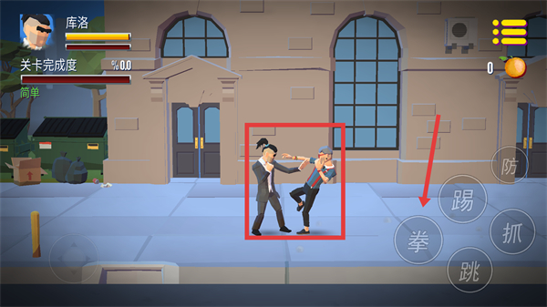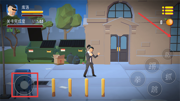 2、用左侧轮盘操控角色移动,右侧【拳-踢】等按钮释放技能,推进【关卡完成度-0.00】进度。
