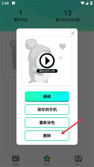 2、进入【作品】页面后,点击已完成的像素作品可触发功能操作菜单。