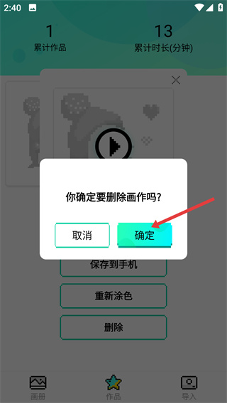 4、选择【删除】后会弹出【你确定要删除画作吗?】的确认框,点击【确定】完成删除。