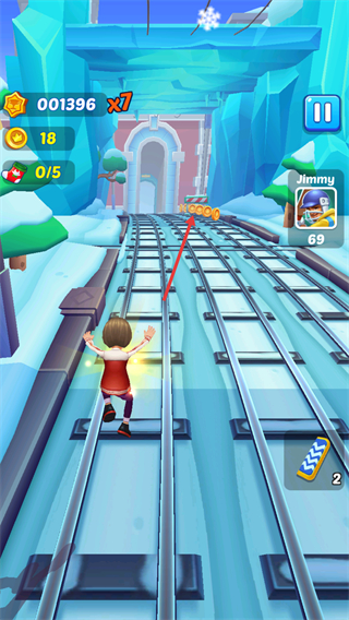 1、操控角色沿轨道奔跑,拾取轨道上的金币和道具。