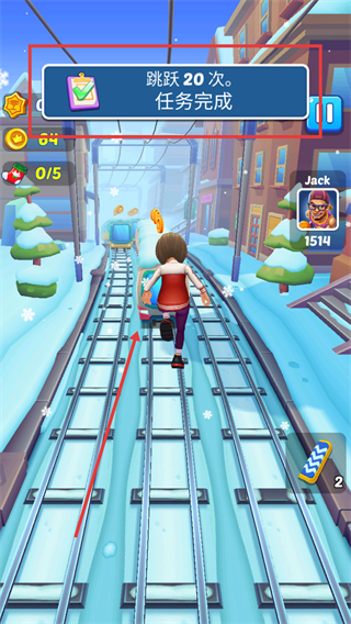 2、完成“跳跃20次”任务后,确认该任务目标达成,继续沿轨道跑酷推进剩余任务。