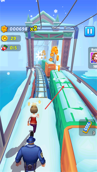 3、操控角色躲避轨道旁障碍物,拾取绿色车厢旁的金币。
