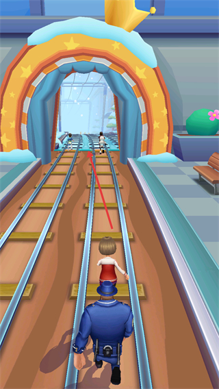 4、操控角色进入带有皇冠装饰的彩虹拱门隧道,沿轨道持续奔跑,继续完成未完成的跑酷任务。