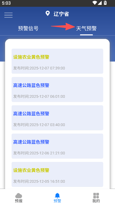 1、聚焦辽宁省天气预警需求,设预警信号天气预警功能,覆盖本地气象预警信息,适配区域化预警服务需求。