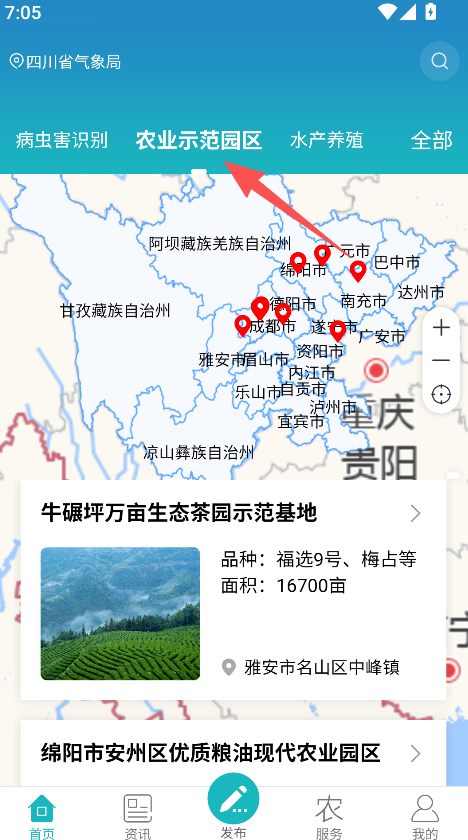 1、聚焦四川农业服务,设农业示范园区等板块,展示园区位置品种面积等信息,适配农业信息获取的区域需求。