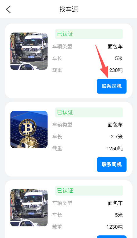 2、找车源功能展示车辆类型车长载重等信息,搭配联系司机按钮,细化车源对接的信息与操作维度。