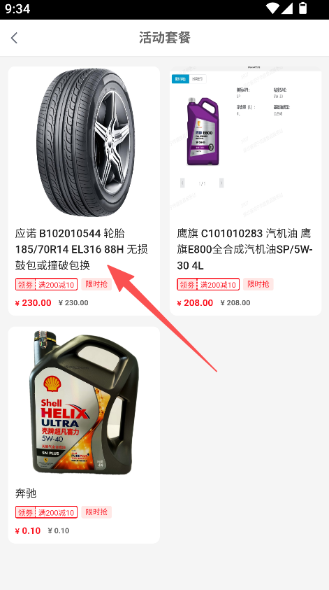 1、具备活动套餐功能,进入对应板块,浏览轮胎、机油等车品的展示信息。