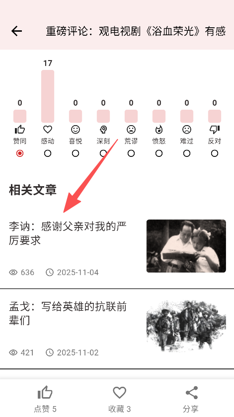 2、文章信息展示详实且含情感互动,增强内容参与感,提升红色文化内容浏览的体验感与实用性。
