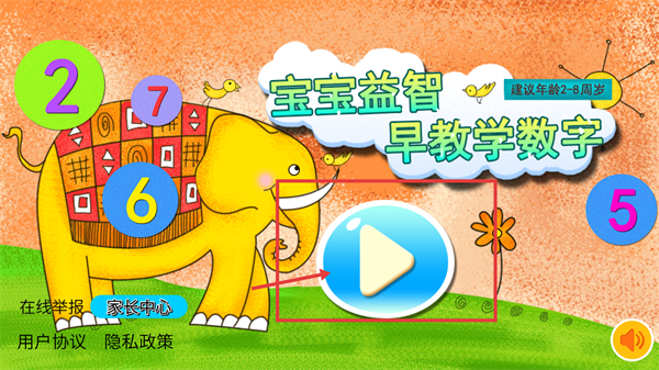 1、进入界面看到【宝宝益智早教学数字】-【建议年龄2-8岁】标识,点击红色框选的播放按钮,即可开启数字教学关卡。