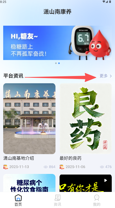 《潇山南康养》是一款专注于糖尿病健康管理的应用。其核心特色是亲切的卡通形象和标语建立情感连接,营造社群氛围。优势在于将严肃的慢病管理转化为可视化、易懂的资讯,结合基地介绍等实体资源,为用户提供了一个集健康数据关注、知识获取与心理支持的温暖、便捷的康养平台。