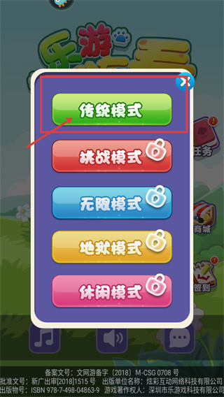 1、看到模式选择界面,点击红色框选的【传统模式】进入游戏,通关技巧是优先选择已解锁模式来熟悉游戏消除规则。