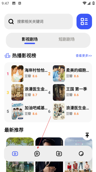 1、在影视剧场页,点击【底部功能按钮】,切换至包含互动模块的页面。