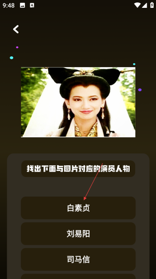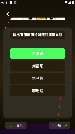 4、在作答完成后,点击【下一题】按钮,即可进入下一个看图猜演员的题目。