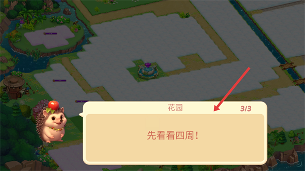 1、进入游戏的花园场景后,根据提示“先看看四周”,浏览当前花园区域的布局与可交互元素。