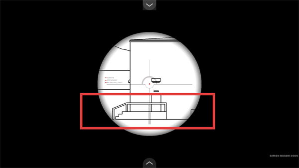 1、进入狙击视角后,瞄准楼梯区域,观察目标动向,准备锁定即将出现的目标角色。