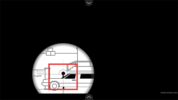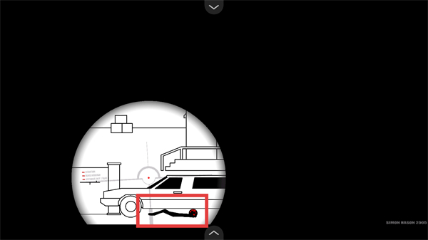 2、移动狙击视角至车辆旁,锁定此处出现的目标角色,调整准星精准定位该目标。